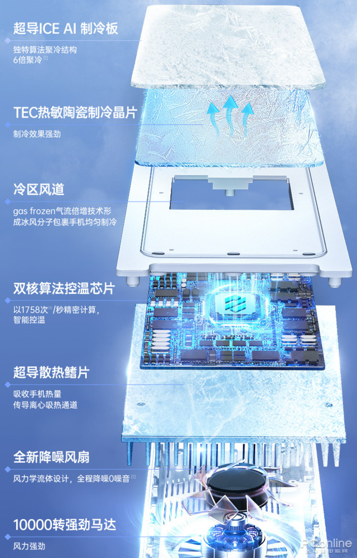 电商介绍页里还有超多“佐料”——超导ICE AI 制冷板、TEC热敏陶制冷晶片、冷区风道、双核算法控温芯片、超导散热鳍片、降噪风扇、万转马达……