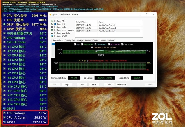 CPU+GPU双烤机测试下,处理器核心温度为81℃-92℃,虽然核心温度明显升高,但依旧保持在比较理想的状态。此时核心频率稳定在2.1GHz。GPU温度为85℃,CPU+GPU功耗释放达到55W+117.51W,约为172W功耗释放,同样是正常功耗水准。