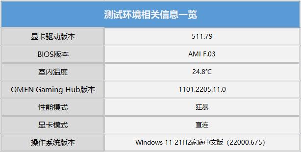 测试之前我们还是将产品能够更新的地方进行了更新,显卡驱动升级到511.79版本,BIOS版本为AMI F.03,OGH版本升级到1101.2205.11.0,Windows 11系统版本更新到21H2 22000.675版本,测试过程中全程开启狂暴模式和独显直连模式,电脑已经100%满电并连接280W电源适配器,测试时室内温度为24.8℃。