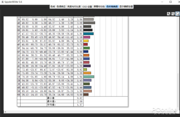 色域、色准表现不错,可覆盖100% DCI-P3色域,ΔE=1.37。美中不足的是最大亮度仅300尼特。