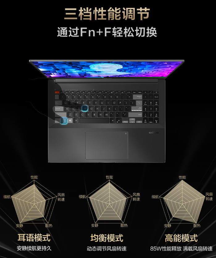 细微处见设计!灵耀Pro16 2022支持三档性能的调节,可以通过Fn+F轻松切换,对续航、性能、风扇转速、散热、安静程度等方面进行调节,将其分为耳语模式、均衡模式和高能模式,不管您出差需要持久续航亦或是创作使用需要性能全部释放,灵耀Pro16 2022都能够做到满足用户在不同情景下的需求。