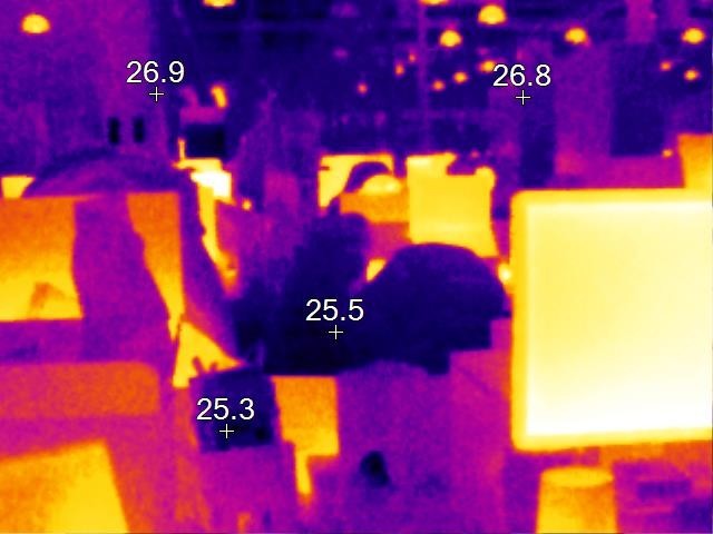 因为涉及到散热测试,所以我们测试的是室内环境温度。从热像仪上可以看出,室温在26℃左右。毕竟现在是初春,室外温度低,室内还开着暖风。26℃左右也是人体的舒适温度范围。