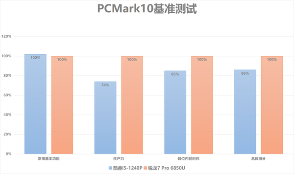 在这项测试里,搭载锐龙7 Pro 6850U有着比较明显的优势,酷睿i5-1240P机型在总成绩上落后了将近15%,生产力和数位内容创作也都有着一定幅度的落后,在常用基本功能上则有小幅领先。