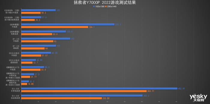 选择《全面战争:三国》、《战争雷霆》、《F1 22》、《无主之地3》、《赛博朋克2077》、《CS:GO》、《魔兽世界》、《古墓丽影:暗影》、《极限竞速:地平线5》、《荒野大镖客2》、《刺客信条:奥德赛》等十余款游戏,分别在1080P、2K,以及高画质、中画质的设定下进行拯救者Y7000P游戏实测,结果如下。