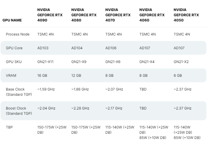 接着是RTX 4070 8G,AD 106核心,140W的最高功率(115W+25W),基础频率为2070MHz,Boost频率为2175MHz;RTX 4060 8G和RTX 4050 6GB都会采用AD107核心,140W最高功率,而且两款型号还会有85W的低功耗版本,并通过Dynamic Boost额外获得10W功耗,更加适合全能本或者轻薄游戏本产品。