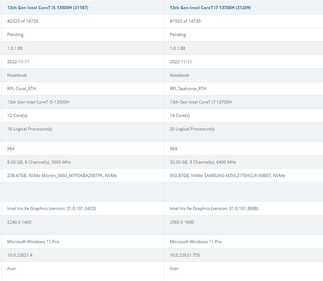 H系列这块曝出的有酷睿酷睿i5-13420H、i5-13500H和酷睿酷睿i7-13620H、i7-13700H。其中i5-13500H和i7-13700H的相关参数已经被找了出来,前者为12核16线程,后者为14核20线程,与前代对应型号保持保持一致,预计核心频率会更高。另外,它们还将支持更快的DDR5 5600MHz和LPDDR5 6400MHz内存。
