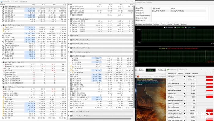 30分钟双烤测试,曙光16 CPU频率2.5GHz,温度84℃,功耗75W;GPU频率1.8GHz,温度76℃,功耗175W,整机功耗稳定达到250W。