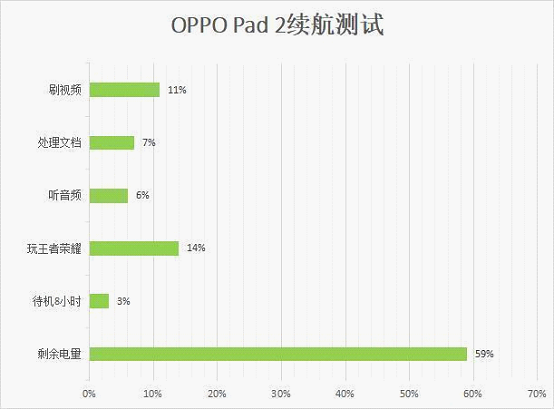 测试结果:OPPO Pad 2刷视频从满电降至89%,消耗了11%的电量,看电子书消耗7%,听音频消耗6%,玩《王者荣耀》消耗了14%左右的电量,待机8小时消耗约3%。总计消耗41%的电量,以此中度频率使用,完全可以满足差旅场景的轻办公以及日常娱乐需求。