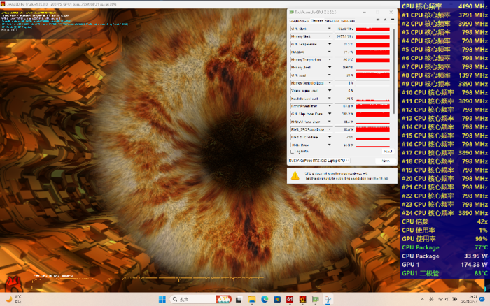 最后是CPU+GPU双烤测试,CPU在75W左右,核心温度约为91℃,显卡则在175W左右,温度在79℃,总功耗达到了约250W,性能释放非常的顶。